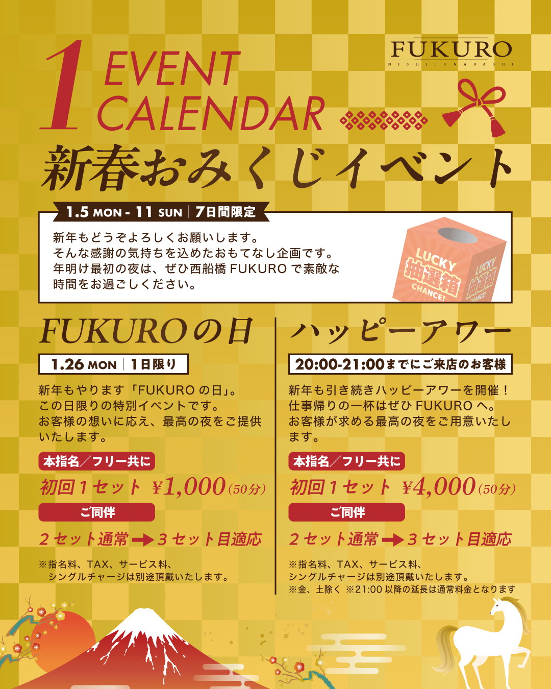 イベント (2026年01月05日配信) 1月イベント情報! 新春おみくじイベント 1/5(月)〜11(日) 7日間限定 FUKUROの日 1/26(月) 1日限り 本指名/フリー共に 初回1セット ¥1000(50分) ご同伴 2セット通常→3セット目適応 ※TAX、サービス料、指名料、シングルチャージ別途 ハッピーアワー 20:00〜21:00までにご来店のお客様 本指名/フリー共に 初回1セット ¥4000(50分) ご同伴 2セット通常→3セット目適応 ※TAX、サービス料、指名料、シングルチャージ別途 ※ご利用は空き次第のご案内(先着順) ※金、土除く ※21:00以降の延長は通常料金となります。